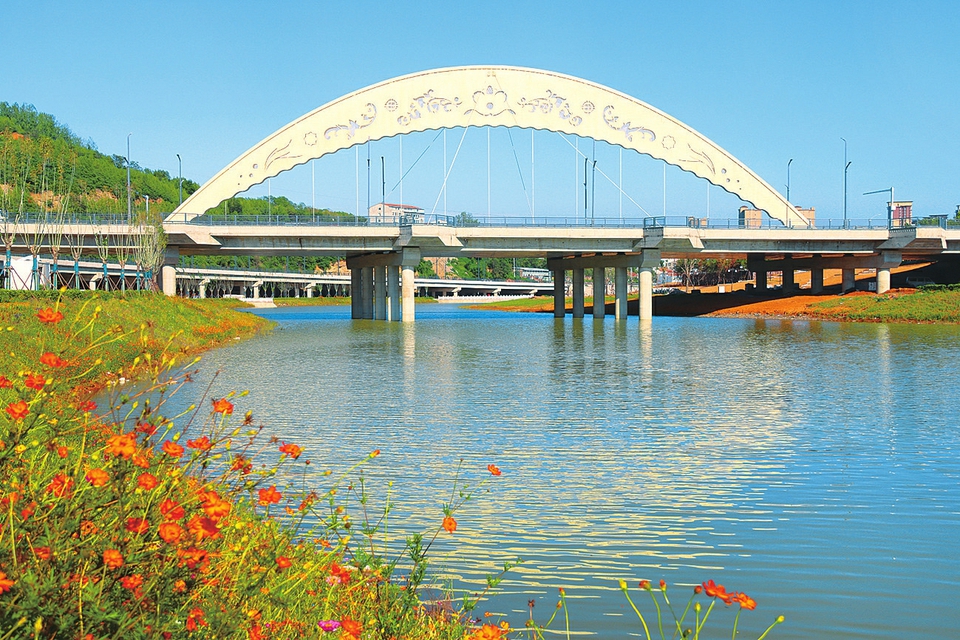 9月12日,陽城縣濩澤河岸邊,硫華菊絢爛綻放,與清澈河水、雄偉大橋相映成趣。近年來,該縣持續加大基礎設施投入,提升濩澤河沿河景觀品質與城市功能,人民群眾獲得感、幸福感持續增強。(陳來全攝)
