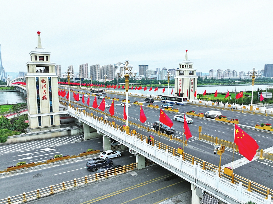9月18日,省城迎澤大橋兩旁,一面面五星紅旗迎風招展、鮮艷奪目。隨著國慶節日益臨近,全省各地道路兩旁、商業街區、景區景點等開始懸掛國旗,營造出熱烈喜慶的氛圍。(記者王瑞瑞攝)