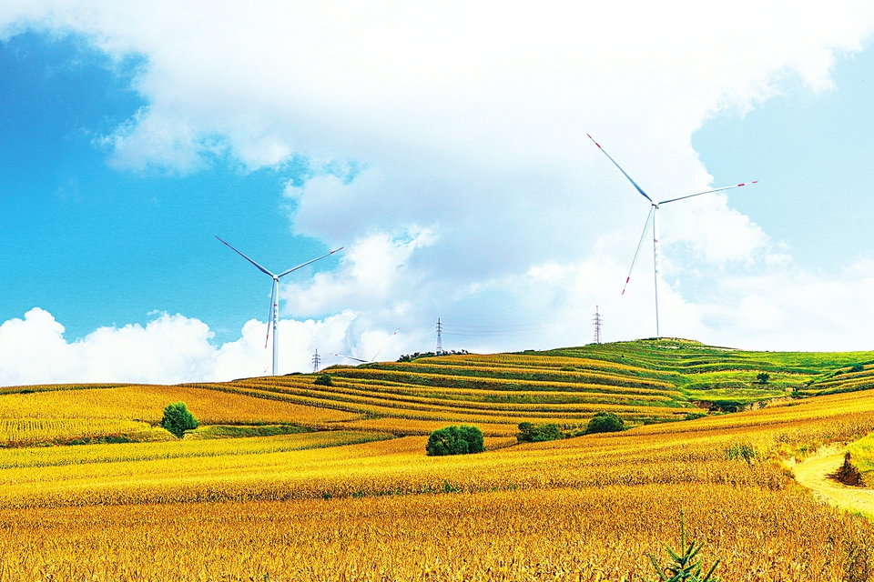 9月26日,神池縣山野染上金黃,巨型風力發電機葉片在微風中緩緩轉動,與周圍的自然景觀完美地融合在一起,繪就一幅清潔能源助力鄉村振興的美麗畫卷。(記者申晉光攝)