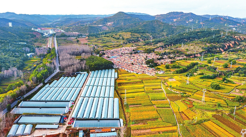 近日,晉中市左權縣下豐堠村,整齊標準的現代農業產業園與整潔的村莊、五彩的秋色構成了一幅和美鄉村畫卷。近年來,該村引導村民發展蔬菜等特色產業,打造鄉村農旅融合新業態,促進農業增效和農民增收。(邢蘭富攝)