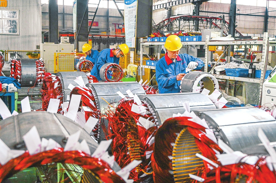 10月4日,在山西平遙華豐防爆電機有限公司生產車間,工人正在加班生產訂單產品。(梁生仁攝)